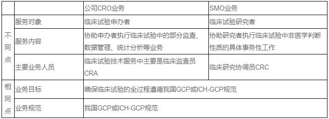 CRO业务与SMO业务的主要异同点如下表所示: